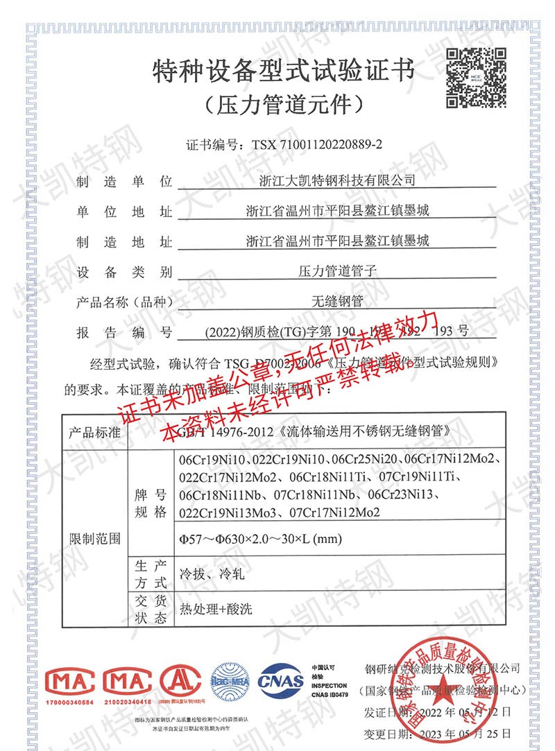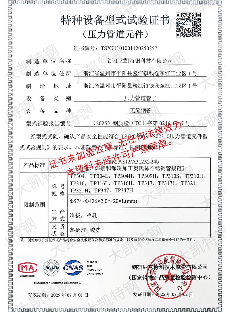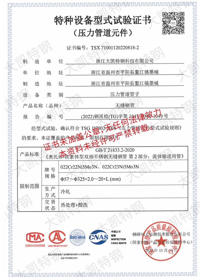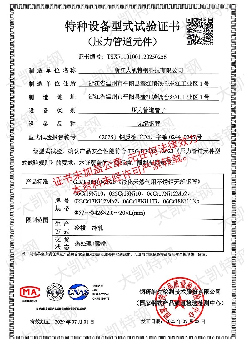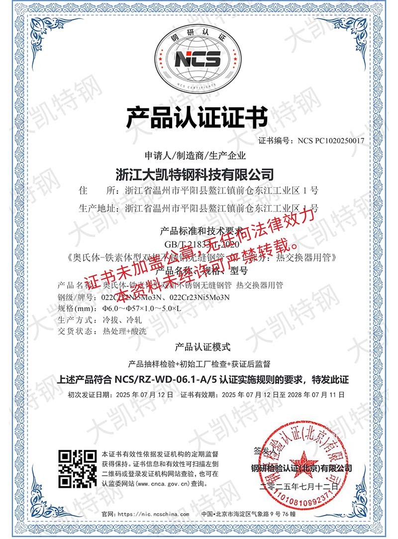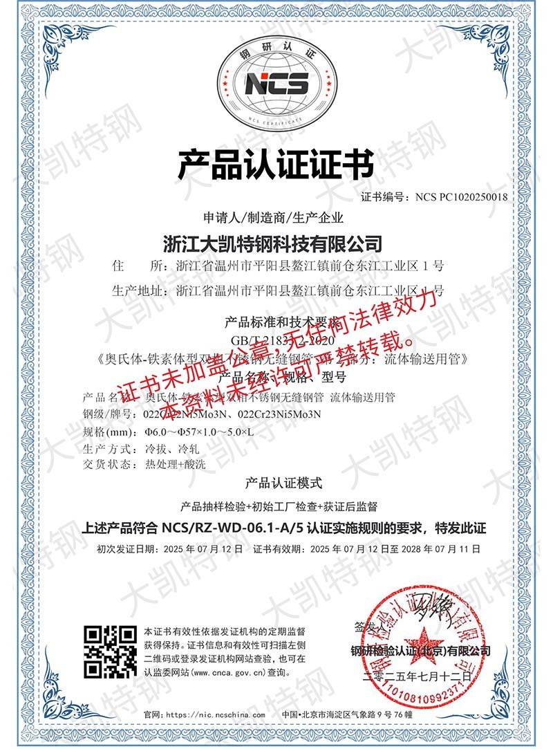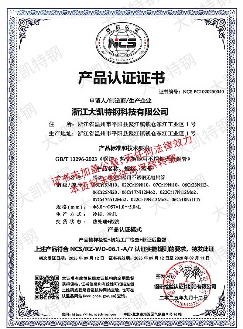浙江大凯特钢科技有限公司2017年创办于浙江温州,公司经历7年的风雨兼程,目前已成长为年销售额近20亿元的集团企业,总占地面积160亩,企业员工400余人,是一家专注于高性能特种钢材料研发与制造的浙江省专精特新企业。生产基地建设有固溶炉余热回收系统,34套冷轧机组、7套冷拔机组、14 套矫直机组,实现了全流程清洁生产并创建了数字中控中心,通过ERP+MES系统,将吨钢能耗减少了18%。现有专业研发团队二十余人,其中高级工程师3人,中级工程师10余人,通过不懈的努力,我们已获得6项省级认证工业新产品,24项自主知识产权,并参与制定了国家级标准GBT17395-2024。2024年,我们与北科大新材料研究院共建联合研究所,打造CNAS级实验室。所内配备万能试验机、水压试验机、超声波探伤仪、涡流探伤仪、手持式直读光谱仪等现代化测验设备,严格把控原材料品质,监控生产过程,把关成品质量。